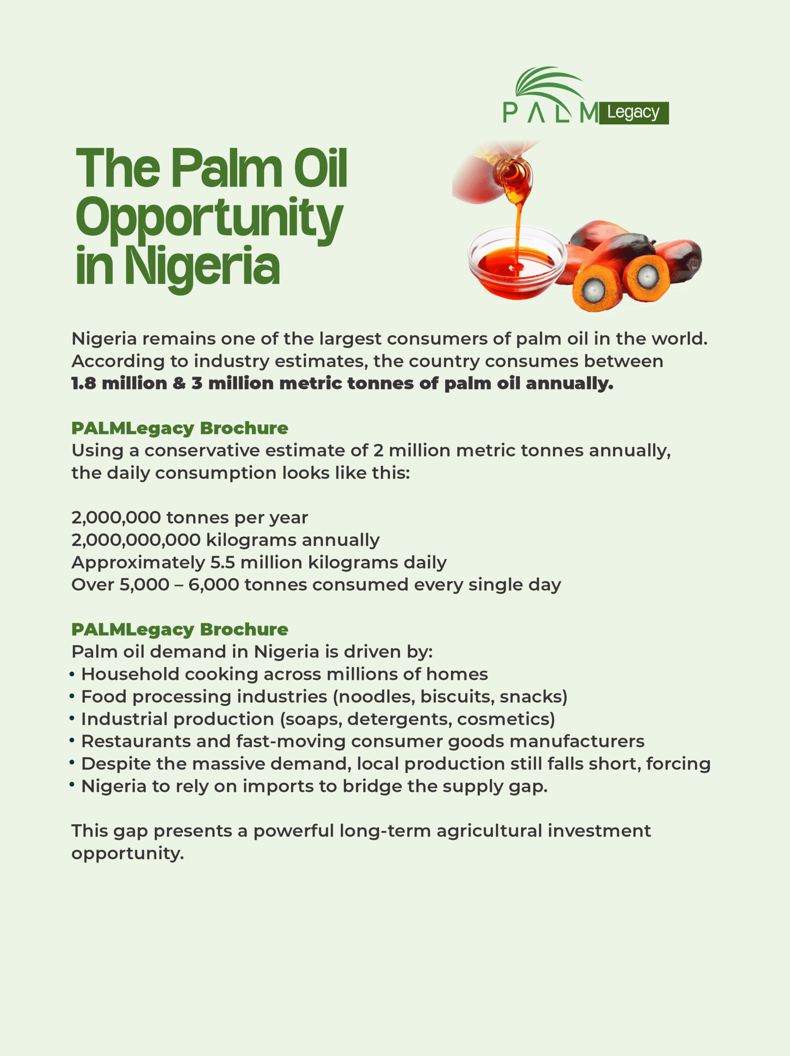 Local supply cannot keep up. Nigeria imports to fill the gap, and that supply deficit is your edge as an investor. Palm oil powers every home, factory, and food brand in Nigeria.