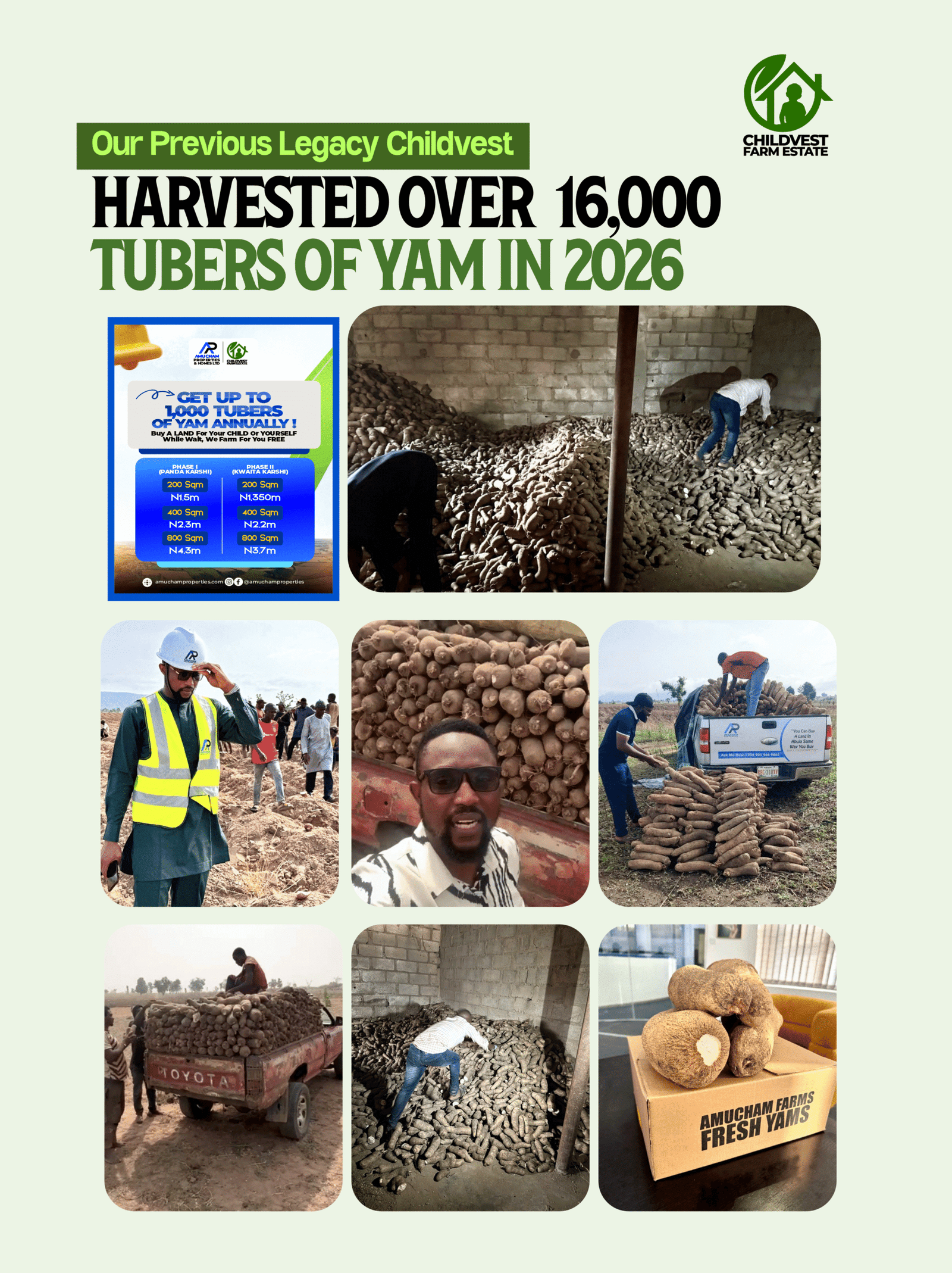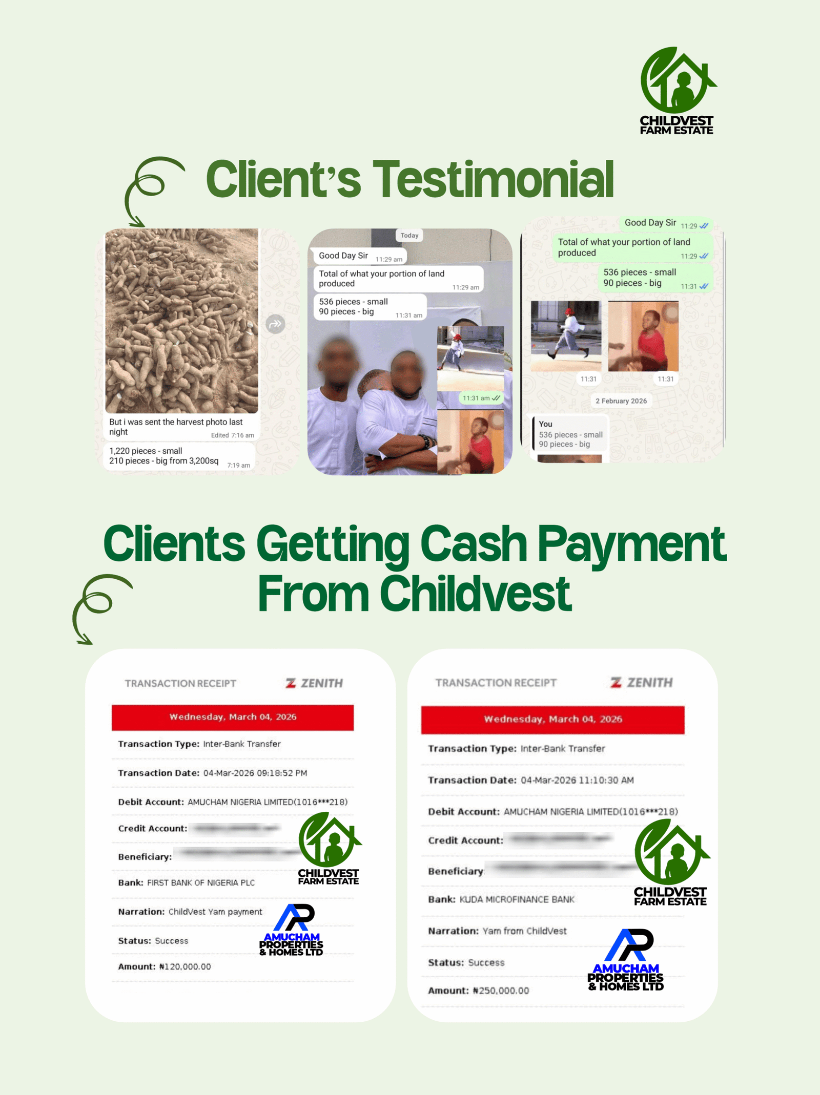 In our previous Childvest Farm Estate, we harvested over 16,000 tubers of yam in 2026 and paid every investor in cash on time. The receipts speak for themselves.