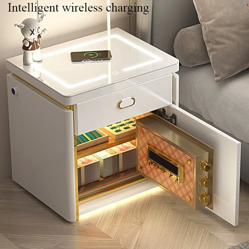 This modern bedside table integrates a fingerprint safe, wireless phone charging, and a Bluetooth speaker, merging security, convenience, and entertainment into one stylish unit